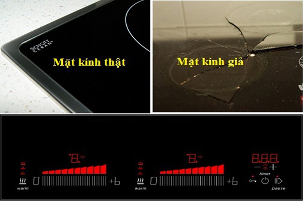 - Mặt kính của bếp là hình thức bên ngoài dễ phân biệt nhất. Mặt kính của bếp từ hàng thật được thiết kế sáng bóng,tinh tế, sắc nét.Bếp giả thường mặt kính mờ đục không sáng bóng như kính bếp từ nhập khẩu chính hãng ngay cả khi lau sạch, không sắc nét. Hàng giả, hàng nhái sau một thời gian sử dụng mặt bếp bị rạn nứt, các nút cảm ứng bị hỏng hoặc liệt hoàn toàn.